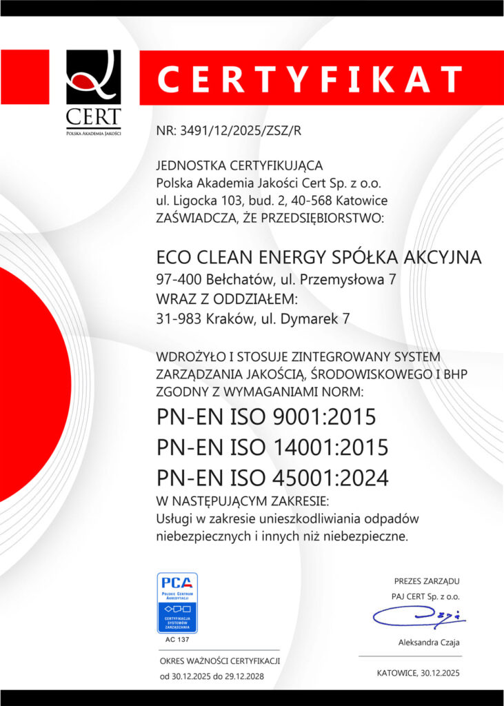 ECO CLEAN ENERGY zapewnia pełną zgodność z obowiązującymi normami i przepisami dotyczącymi unieszkodliwiania odpadów medycznych. Nasze zakłady są certyfikowane zgodnie z międzynarodowymi standardami ISO, co potwierdza naszą zaangażowanie w jakość i bezpieczeństwo. Regularne audyty oraz kontrole wewnętrzne gwarantują, że nasze procesy są na bieżąco aktualizowane zgodnie z najnowszymi regulacjami prawnymi i najlepszymi praktykami w branży. Certyfikaty ISO są dowodem na nasze zobowiązanie do ciągłego doskonalenia i dbałości o najwyższe standardy unieszkodliwiania odpadów medycznych.